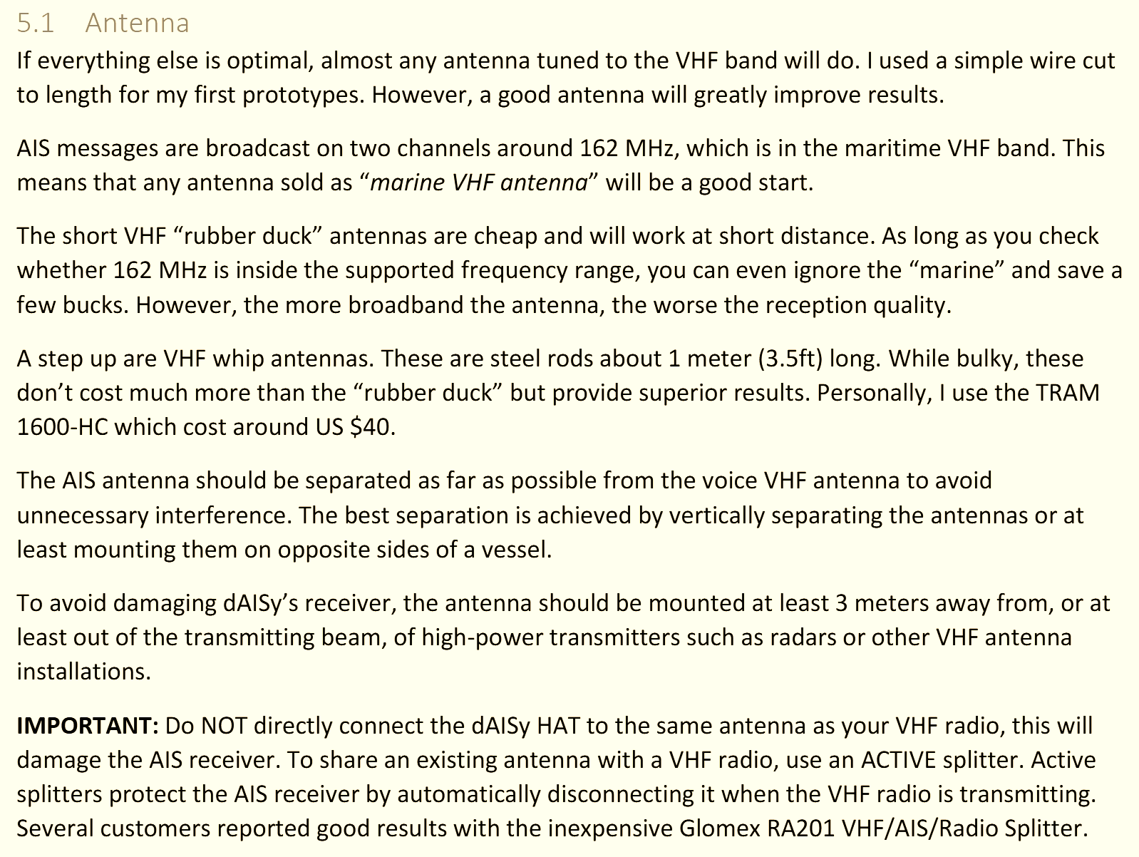 The dAISy HAT is matched for an antenna with an impedance of 50 ohms, which is standard for marine VHF communication